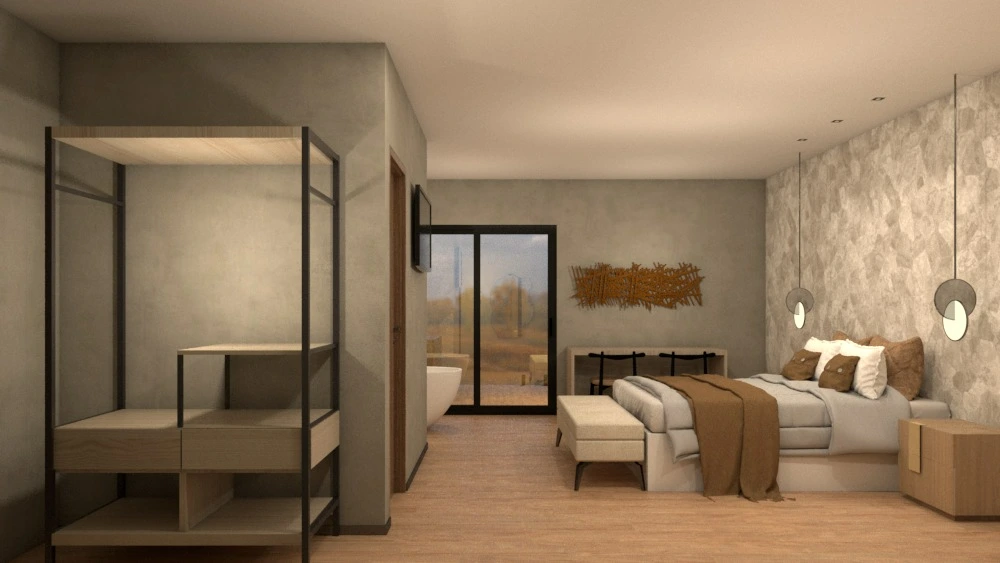 Luxuoso chalé com decoração sofisticada, oferecendo cama Queen (400/500 fios), banheira de hidromassagem no quarto, minicozinha completa e varanda privativa. Inclui roupões, amenities exclusivos, Smart TV e ar-condicionado.
